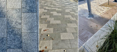 - A mixture of paving stones were used throughout the rest of the project. Silver-grey in both flamed and bush-hammered finish, mid grey, and green in flamed finish only.