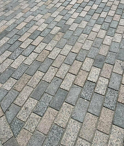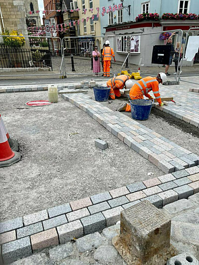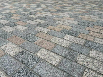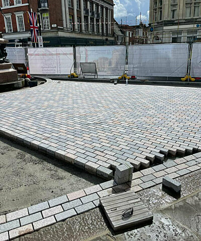 Portuguese Granite Setts Mix - These robust granite setts were selected for their strength, character, and natural colour variation — ideal for a heritage setting with heavy pedestrian use. The material offers a classic look with proven longevity.