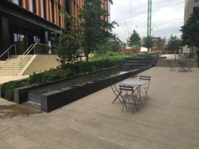 Located just steps from one of the UK’s busiest transport hubs, this terraced, cascading water feature is a serene focal point within the bustling King’s Cross redevelopment. Designed to bring calm, movement, and reflection into the public realm, the installation transforms its surroundings by day and night—thanks to expert lighting and enduring material choices.